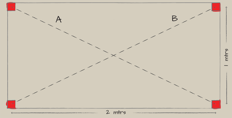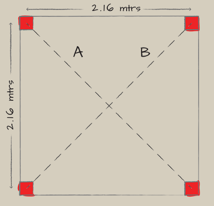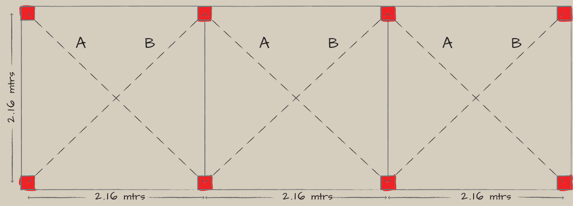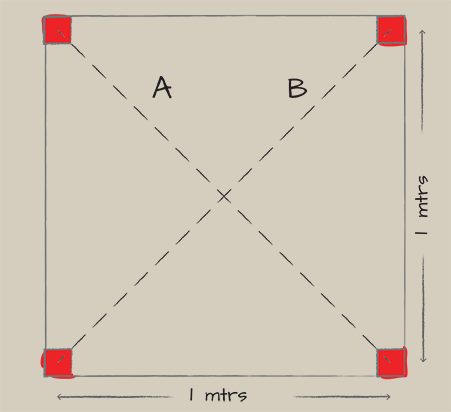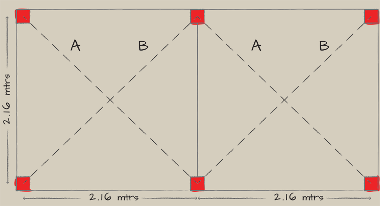 Once you have prepared and measured the site it is a good idea to stake out the area and mark clearly where your posts will be situated before you start assembly. Using a tape measure or a piece of string, clearly layout the full extent of the structure's footprint with either temporary markers or stakes. Lines A and B should be equal in length. Ensure that the footprint is completely straight by using a builders square to check that all corners are 90 degrees.