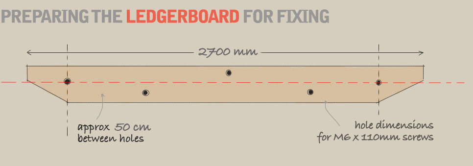 Offer the ledger board up to the wall making sure that the bottom edge is exactly 2400mm from the ground and when it is centered and squared with the plumb line in the middle of the first 40mm joist hanger gap, use a pencil to mark a line on the wall where the end of the ledger board rests. This mark is your starting point (use a spirit level here to ensure the ledger board is completely horizontal) and taking a drill with a small pilot masonry bit (3mm), drill through the ledger board holes and into the wall to a depth of half an inch or so. Continue to do this with all of the holes that you have made in the ledger board. Once done, take the ledger board down and deepen the holes in the wall by a further 50mm using the same 3mm pilot masonry bit.