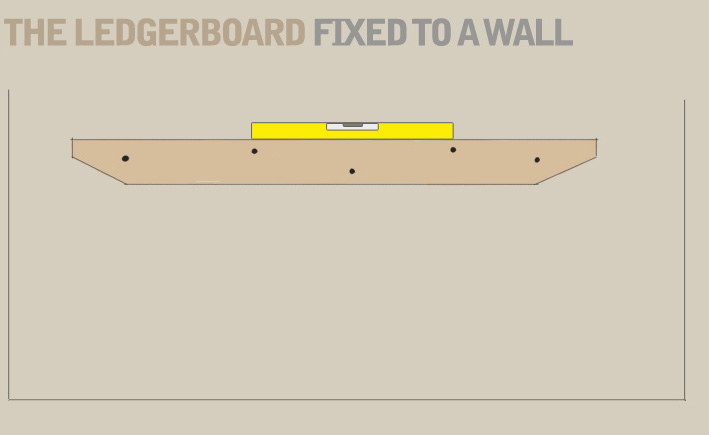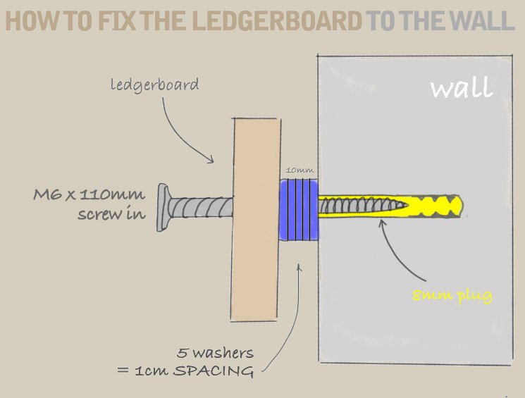 After you have drilled the holes in the wall, push the screws through the ledger board and spacers (see Fig 12) lining them up with the plugs in the wall and screw them in tight ensuring a firm attachment. A great tip here is to 'cap' the end of the screw, after it has been pushed through the ledger board and spacers, with a small bit of blutack or selotape, which prevents the spacers from falling off the screw as you offer the ledger board up to the wall for fixing.