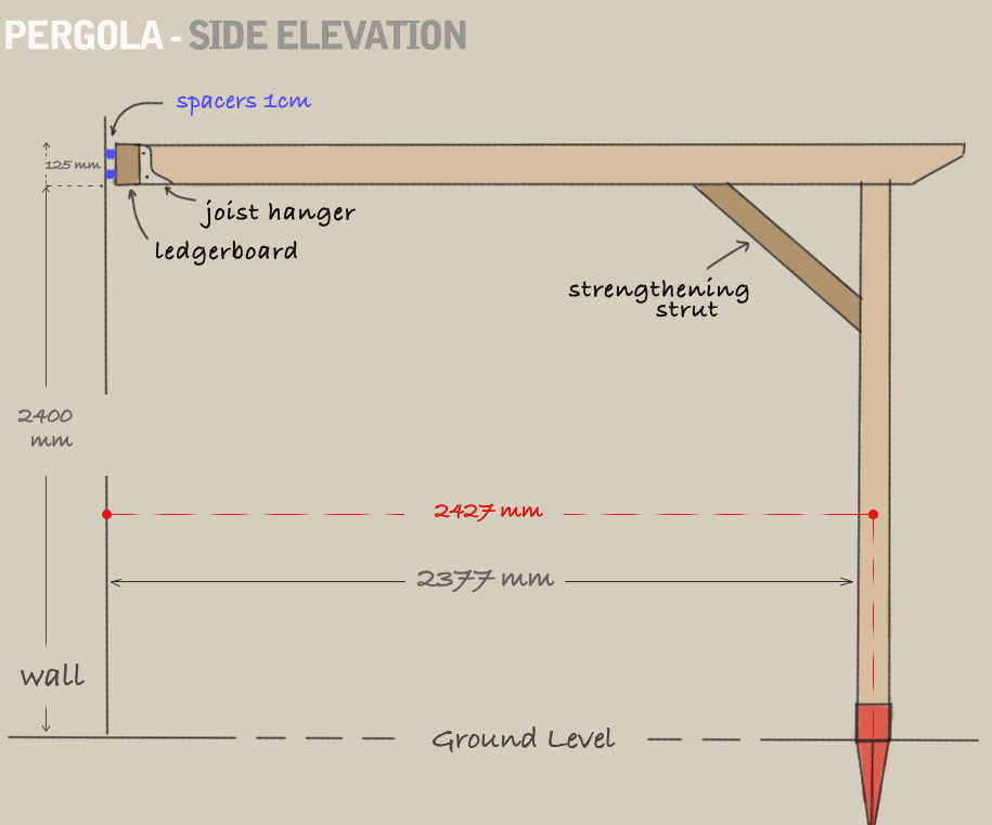 Figure 13 below shows how the pergola will look from the side elevation clearly illustrating the 1cm gap between the wall and the ledger board. As not all walls are flat, you are able to adapt the spacers by adding or taking them away to ensure a flat fit against the wall.