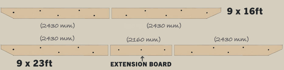 If you have ordered either of the two longer pergola modules, simply '&lsquo'butt up' the second ledger board on the 9ft x 16ft module or the 'extension' board plus second ledger board for the 9ft x 23ft module against the one already screwed into the wall making sure there is no gap between the boards and repeat the above process in Step 3. See Fig 13A below
