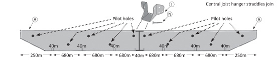 Starting at one end, prepare the ledger board for the joist hangers by measuring 250mm and marking with a pen on the lower edge of the ledger board. this will be where the first 'outside wall' of the first joise hanger should be positioned. Measure, from this mark, another 40mm and mark again. 40mm is the width of the joist hanger and represents where the other side of the joist hanger will be. Then, from this second mark, measure a further 680mm and mark. This is where the first outside wall of the second joist hanger should be sited. Continue this process for all the joist hangers and you will be left with the same 250mm length at the other end of the ledger board making the joist hanger positions symetrical.
