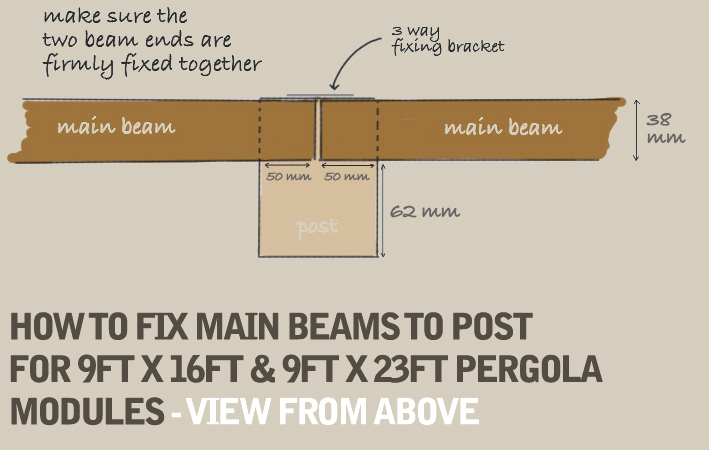 If you have ordered either the 9ft x 16ft or 9ft x 23ft pergola modules, you will need to join together two main beams (for the 9ft x 16ft module) or two main beams plus the central extension board (for the 9ft x 23ft module) using the supplied 3–Way ('T' shape) fixing plate as illustrated in Fig16 & Fig 17 below. These longer modules have been design in such a way that the join will fall in the centre of the 'notched' post, so before fixing in place with the 3-Way fixing plate, check that there is no gap between the boards. These central post(s) do not have the coach bolt, washer and nut fixings as these are only required on the outer posts.
